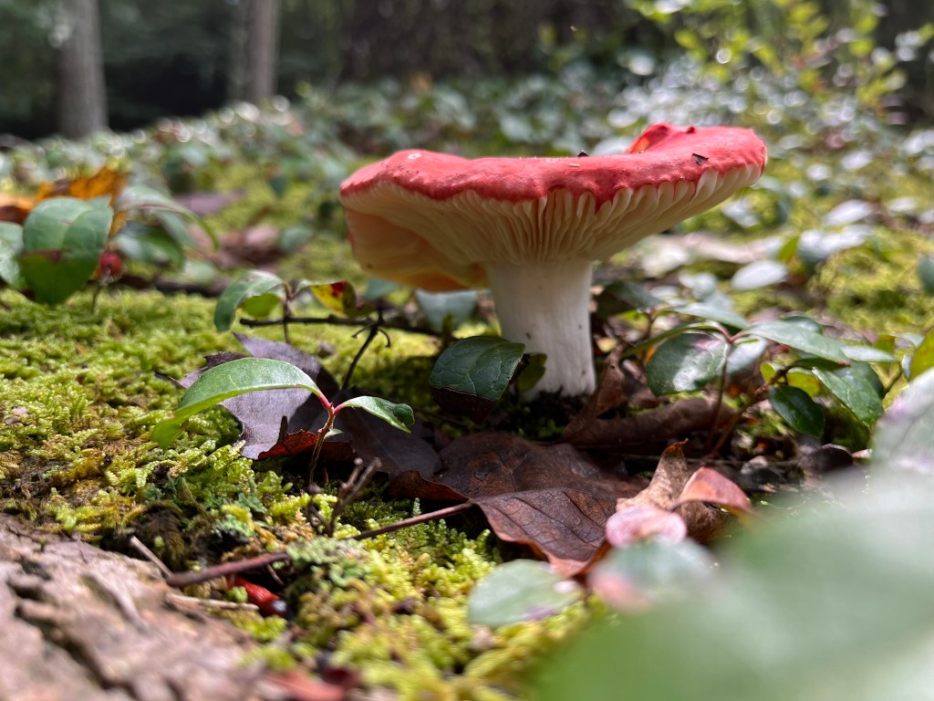 I noticed that the mossy ground had a huge number of mushrooms. I recognized brittlegills and jack-o’-lantern mushrooms right away. I also saw mushrooms composed of many small yellow spires congregated near a field mouse shelter. Some of the mushrooms were covered in a white substance- mycelium! I hadn’t seen such a huge variety of fungi in one spot- there were many I wasn’t able to capture in a photograph.