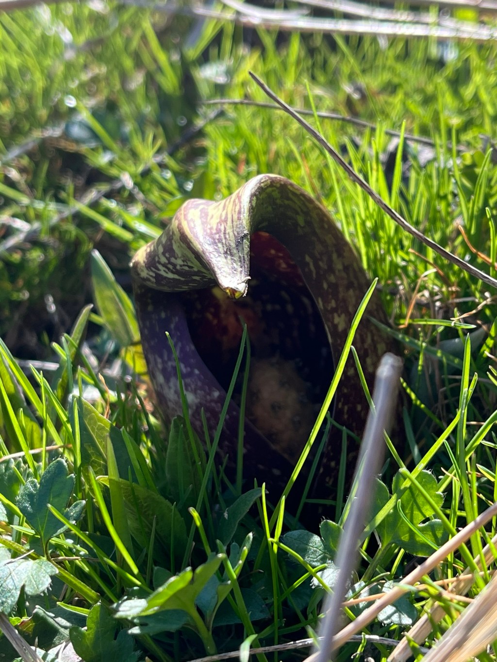 Close to the boardwalk, tributaries of Thompson Run and Slab Cabin Run flowed by. Near their banks sprouted skunk cabbage. While many folks dislike the smell of these Spring flowers, I don’t mind at all. The smell reminds me of my grandfather’s trapping shed and my college-era fieldwork. Despite the smell, skunk cabbage flowers are beautiful. They look like someone speckled lime-green leaves with burgundy wine.